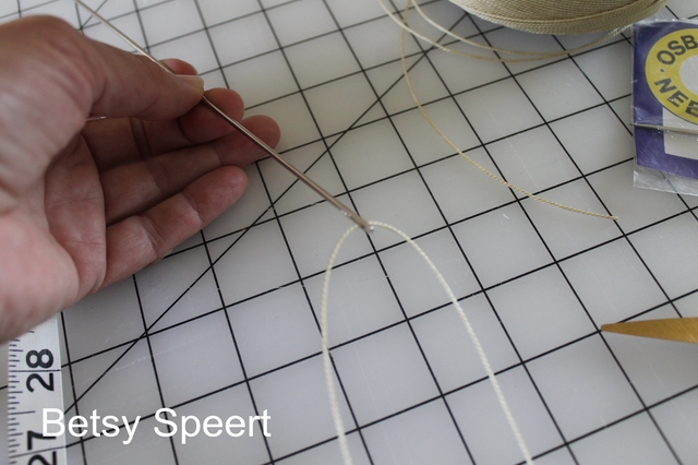 Pulled the needle off the thread and threaded the twine that was still sticking out the front of the chair through the button and then threaded the needle and stuck it again through the chair and out the back.